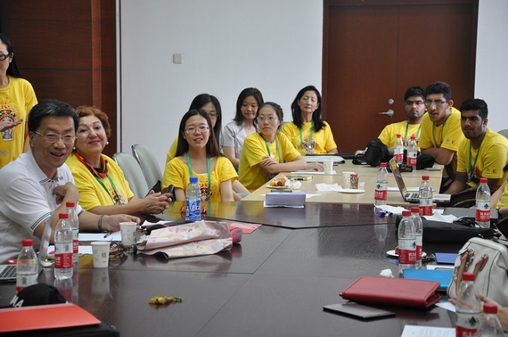 来自加拿大York大学和北航的暑期学校师生们向怀校长依次作了自我介绍,怀校长首先向York大学的师生们不远万里来到北航表达了热烈的欢迎,感谢他们在促进两校国际化交流方面所做出的努力。交流中,怀校长以学员们所身着的包含了两国文化元素的暑期学校文化衫为视角,用一口流利的英语与学员们畅谈中加两国的文化与友谊,并认真倾听了两校学员对于文化衫上所包含的两国文化元素的理解。怀校长指出,我们所处的世界是丰富多彩又复杂多样的,需要具备真诚的友爱(friendship)、良好的理解领悟能力(understanding)和团队合作精神(teamwork)来训练我们的思维,方能从容应对未来的各种挑战,希望两校的学员们能够以此次中加社会科学中心暑期学校为契机,秉承着“同一个团队,同一个梦想”(One Team,One Dream)的信念,不断加深对于彼此的认同和理解,为提升北航和York大学的合作水平,增进两校师生的友谊奉献一份力量。怀校长睿智而富有激情的讲话博得了学员们阵阵掌声,交流结束后,怀校长与暑期学校的全体师生们一起合影留念。
