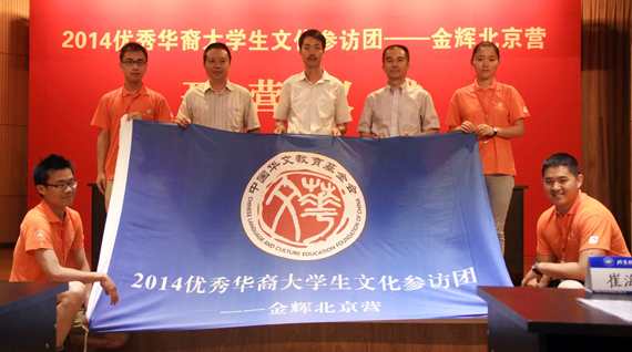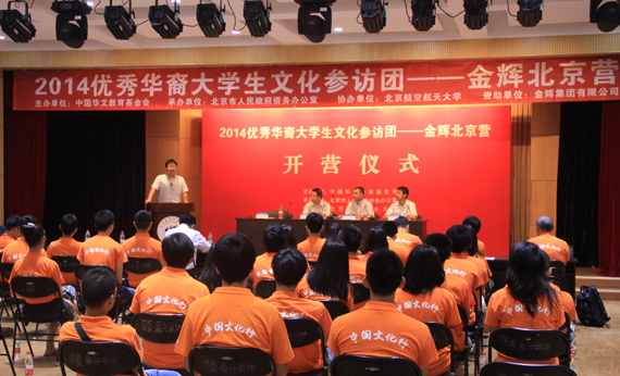 北航新闻网8月1日电(通讯员 庞瑜) 7月31日,“2014优秀华裔大学生文化参访团——金辉北京营”开营仪式在我校晨兴剧场举行。中国华文教育基金会副秘书长李献国、北京市人民政府侨务办公室副主任高云超、中国华文教育基金会项目一部主任熊志远、我校研究生工作部部长雷晓锋、金辉集团有限公司副总裁林茂祺出席了开营仪式,来自美国、加拿大、葡萄牙、西班牙和中国的50名优秀华裔大学生和带队老师参加了此次活动。仪式由营员代表、我校学生李璇主持。