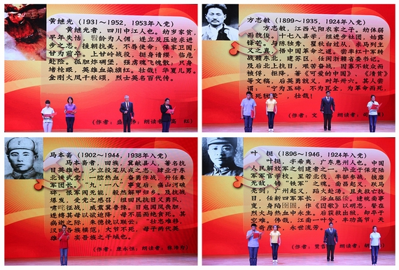 伴随开场悠扬的民乐合奏,学生民乐团带来的一曲《映山红》拉开了朗诵活动的帷幕。各学院师生代表声情并茂的朗诵,老一辈艺术家们精神饱满的演绎使近百位历史人物鲜活起来,并将我们带回那烽烟四起,家国动荡的年代。从社会主义革命时期探索救亡图存道路的不屈斗争,到社会主义建设时期的为实现国家富强而进行的无私奉献,再到改革开放时期为群众利益呼号奔走的鞠躬尽瘁。从李大钊到焦裕禄再到罗阳,一代代共产党人将全部的热情和生命献给了人民,献给了国家。