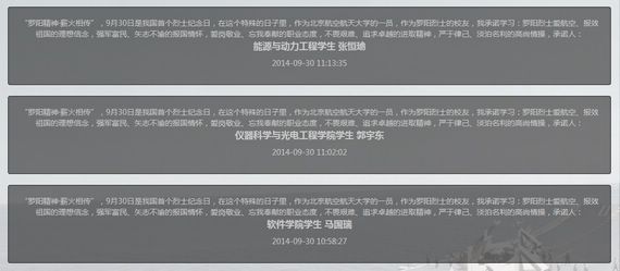 在北航主页,广大师生在网上为罗阳烈士“献花圈,点蜡烛”,实名承诺:学习罗阳烈士航空报国的理想追求,强军富民、矢志不渝的坚定信念,爱岗敬业、忘我奉献的职业态度,不畏艰难、追求卓越的进取精神,严于律己、淡泊名利的高尚情操。