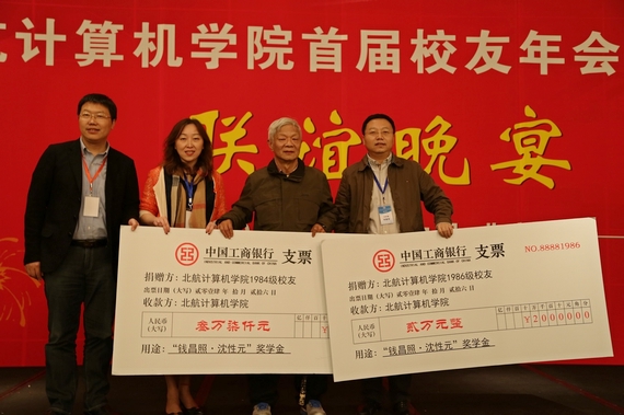 交流与发展论坛结束后,校友们陆续来到大宴会厅。座无虚席的宴会厅随处可见校友们的欢声笑语。晚上六点半,晚宴主持人计算机学院校友会秘书长徐东英女士宣布联谊晚宴正式开始。北航计算机学院前系主任、原教育部副部长赵沁平院士和北航校友总会的老领导纷纷上台致辞,对本届计算机学院校友年会的成功举办表示肯定,并欢迎各位校友和嘉宾的到来。现场还举行了为在过去两年里为母校做出无私奉献的校友们颁发感谢证书的仪式。首先为 “钱昌照·沈性元”奖学金捐款的1984级校友和1986级校友颁发感谢证书;然后为筹集“1989级励学基金”的1989级校友颁发感谢证书;最后为参加“北航计算机学院优秀校友进沙河”活动的校友们颁发感谢证书。校友们无私的奉献精神和回报母校的感恩情怀成为了晚会最温馨的风景。随后,1995级校友陈红女士和北航招生就业处副处长刘睿老师共同发起了《北航计算机学院毕业生职业发展报告》项目启动的倡议,为计算机学院学生的人生规划和职场发展提供有效的帮助,获得了全体校友的支持与认可。最后,联谊晚宴在校友们关于青春的回忆里,在《仰望星空》的歌声中圆满落幕。