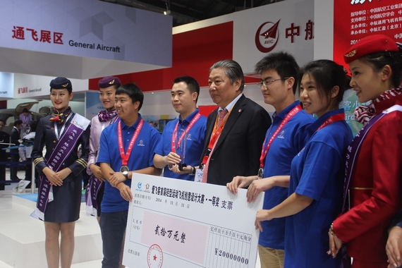 北航新闻网11月13日电(通讯员 郭祖博) 11月11日,由中航通用飞机有限责任公司和爱飞客航空俱乐部主办的爱飞客首届轻型运动飞机创意设计大赛颁奖仪式在珠海航展上隆重举行。该创意设计大赛最终评出一等奖1名、二等奖2名、三等奖3名。我校“梦想”系列飞机设计团队获得一等奖,并获得20万元奖金。获奖飞机“梦想四号”制成大比例模型在航展上与公众见面,中航工业董事长林左鸣亲自为我校获奖团队颁奖。