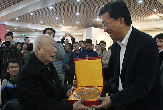 校长怀进鹏院士向欧阳中石先生赠送“校训树”铜盘 孙也程/摄影