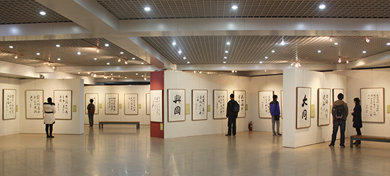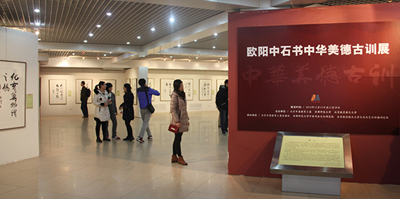 “欧阳中石书中华美德古训展”将书法这一蕴含中华传统文化精髓的艺术表现形式,与中华传统美德古训相结合,展厅中欧阳中石先生书写的60余幅的书法精品,以“德”为统领,深溯德之本源,理清德之应用与发展,分为明德、修身、和合、兴国、大同五部分,将历代名家关于美德的名言和书法艺术创作有机整合一体,既体现以“修齐治平”为核心的传统美德精神,又适应时代文化发展和精神审美的需要。为做好本次高校巡展活动,我校做了大量细致的筹备补充工作,详尽标注了每一条传统古训的典出及释文,方便师生及社会观众加深对中华传统美德的理解与认知。