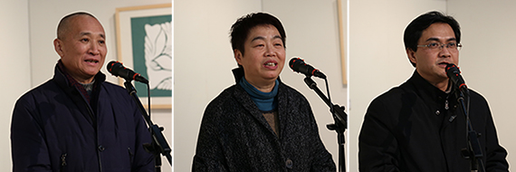 艺术家蒯世英(中),北航宣传部部长、文化与艺术传播研究院执行院长蔡劲松教授(右)致辞