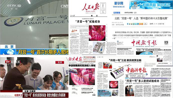 “月宫一号”的试验成功引起了广泛关注,新华社、中央电视台、《人民日报》、《光明日报》、《中国教育报》、《科技日报》、《中国科学报》等近30家新闻媒体纷纷到场进行采访报道,社会反响热烈、持久。同时,作为“月宫一号”总设计师、首席科学家的刘红教授是俄罗斯自然科学院外籍院士、国际宇航科学院通讯院士,她带领的“月宫一号”团队始终秉承“站在巨人的肩上才能看得更远走得更高”的理念,以广域的国际化视野和宽阔的国际化胸襟,多方引进国外智力,积极开展国际合作,充分借鉴国际先进经验,十年引进来自俄罗斯、美国、加拿大、日本等国专家100余人次,讲学开课、联合开展合作研究。“月宫一号”也成为国际交流助推科研引领、国际合作催生科研硕果的完美典范之一。2014年9月,“月宫一号”研究成果以其广泛的国际化基础以及优异瞩目的国际交流合作成果,以排名第三的成绩,入选“新中国65年十大引智成果”。