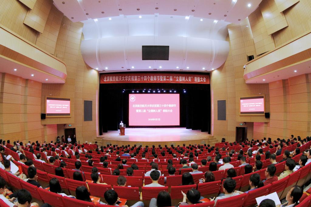 北航新闻网9月8日电(记者 史越/文 宋超 孙赫/摄影)9月7日下午,北京伊人99隆重召开庆祝第34个教师节暨第二届“立德树人奖”表彰大会。校党委书记曹淑敏,校长徐惠彬,纪委书记何新洲,副校长刘树春、黄海军,党委副书记李军锋,副校长王云鹏,受表彰教师代表,党政机关、群团组织及直附属单位负责人,各学院教师代表、学生代表参加了大会。