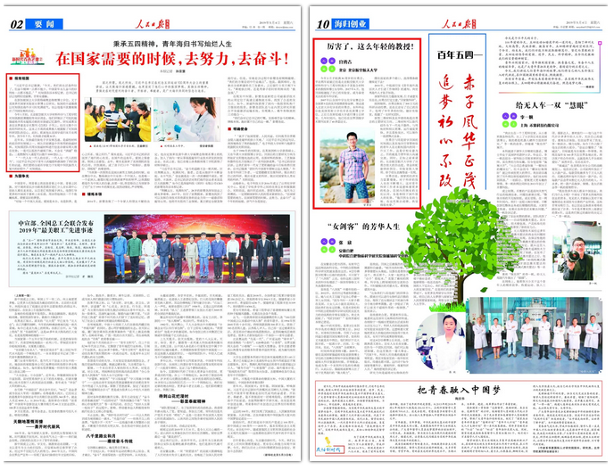 2019年5月4日,五四运动100周年当天,《人民日报海外版》第2版、第10版分别报道两位北航海归青年教授刘知琪、宫勇吉的故事: