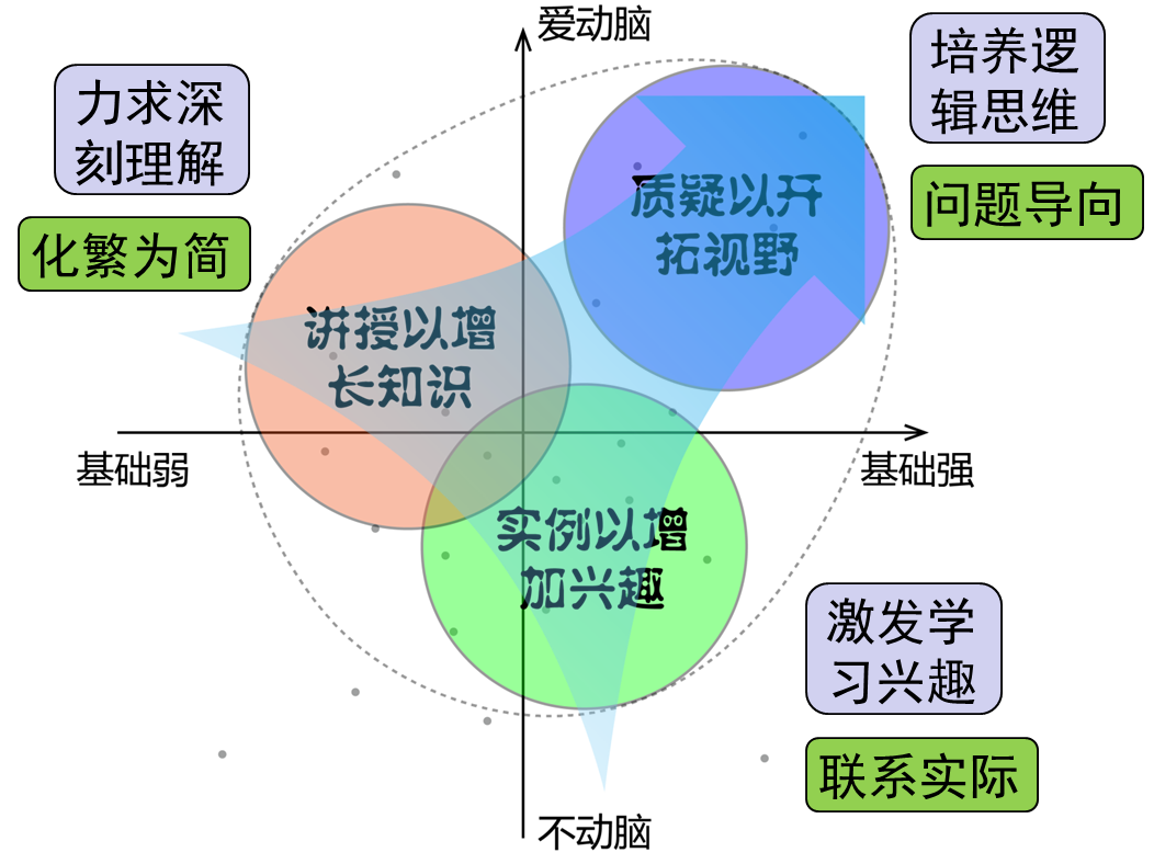 王洪伟将学生按照知识基础的强弱以及善于思考能力高低进行分层次教学。对于基础强又善于动脑思考的学生,他们具有极强的学习欲望和获取新知识的能力,并不需要过多地引导,很多时候教师要做的是给他们提供足够的资源,给予他们自身发展的空间。然而这样的学生毕竟是少数,中间的学生才是大多数。所谓“学而不思则罔,思而不学则殆”,一些基础较强的学生可能并不爱动脑思考,也就很难再上一层楼,而让那些基础薄弱的学生过于注重思考则无异于盖空中楼阁。