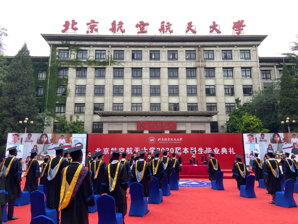 8点,在北京伊人99的主楼广场上,伴随着激昂的乐曲,2020届本科生毕业典礼暨学位授予仪式正式举行。除了现场68名本科毕业生代表,身在祖国各地的3400多名北航毕业生,与家人亲友、母校一起,共赴这场“云端”之约,以这种特别的形式为大学生活作结。
