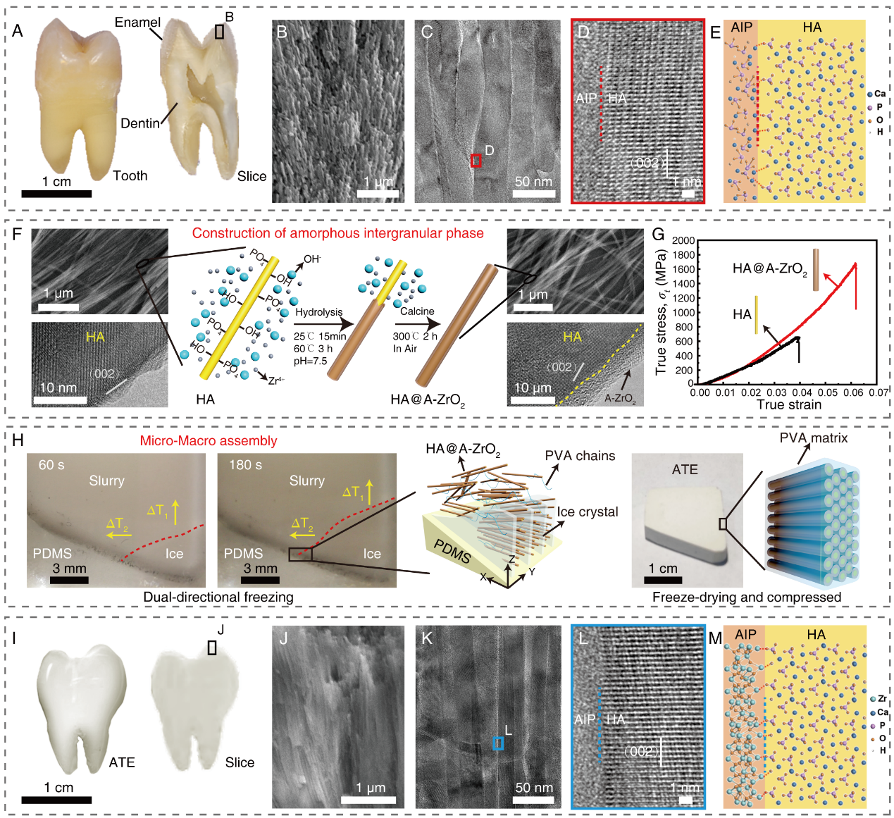 郭林教授研究团队,设计了基于“纳米结构单元的宏量合成及可控组装”的多尺度类牙釉质复合材料合成路线,实现了迄今为止与牙釉质结构最为相近的类牙釉质复合材料的可控制备。具体来讲,通过水热法设计合成了与牙釉质釉柱微观尺寸接近的羟基磷灰石纳米线;通过合理调控材料的生长与成核,实现了非晶氧化锆陶瓷层在羟基磷灰石纳米线表面的均匀生长,模仿了天然牙釉质的无机非晶间质层;合理改进定向冷冻装置,实现了晶体/非晶复合纳米线与聚合物的复合及宏观尺寸可控组装,制备得到了从原子尺度到宏观尺度皆具有类牙釉质结构的人工牙釉质。