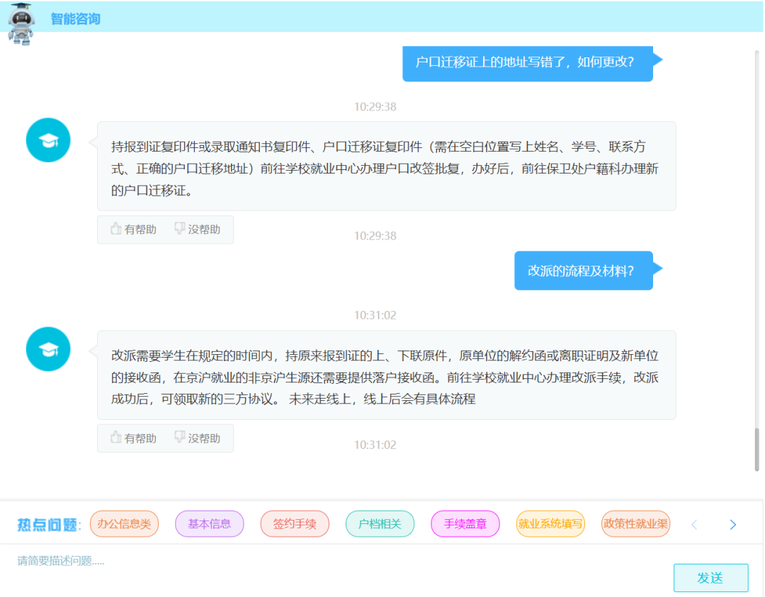 线上咨询业务全面开通,进一步优化毕业生就业手续办理和政策问题的咨询服务,智能咨询提供常见问题的解答,对于个性化问题,使用在线提问功能,由老师进行针对性解答,精准回复。