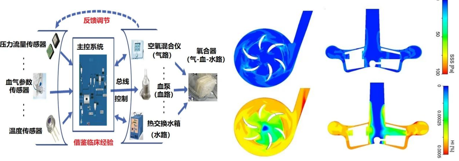 左:自主研制高性能ECMO多目标多参数集成反馈系统、右:ECMO血泵多目标多参数血流动力学优化