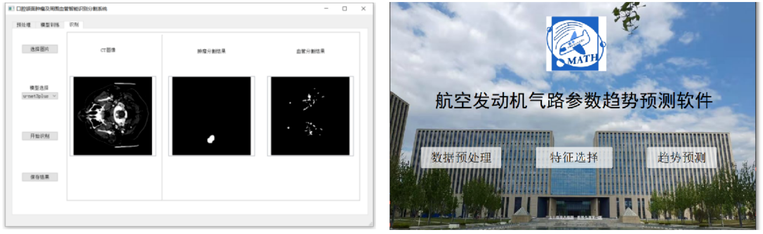 左:口腔颌面肿瘤及周围血管智能识别分割系统;右:航空发动机气路参数趋势预测软件界面