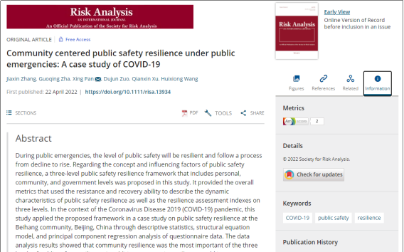 相关研究成果以“Community centered public safety resilience under public emergencies: A case study of COVID-19(公共事件下以社区为中心的公共安全韧性——以COVID-19为例)”为题发表在风险学会会刊、风险领域Top1期刊(Q1,IF=4.000)Risk Analysis上。
