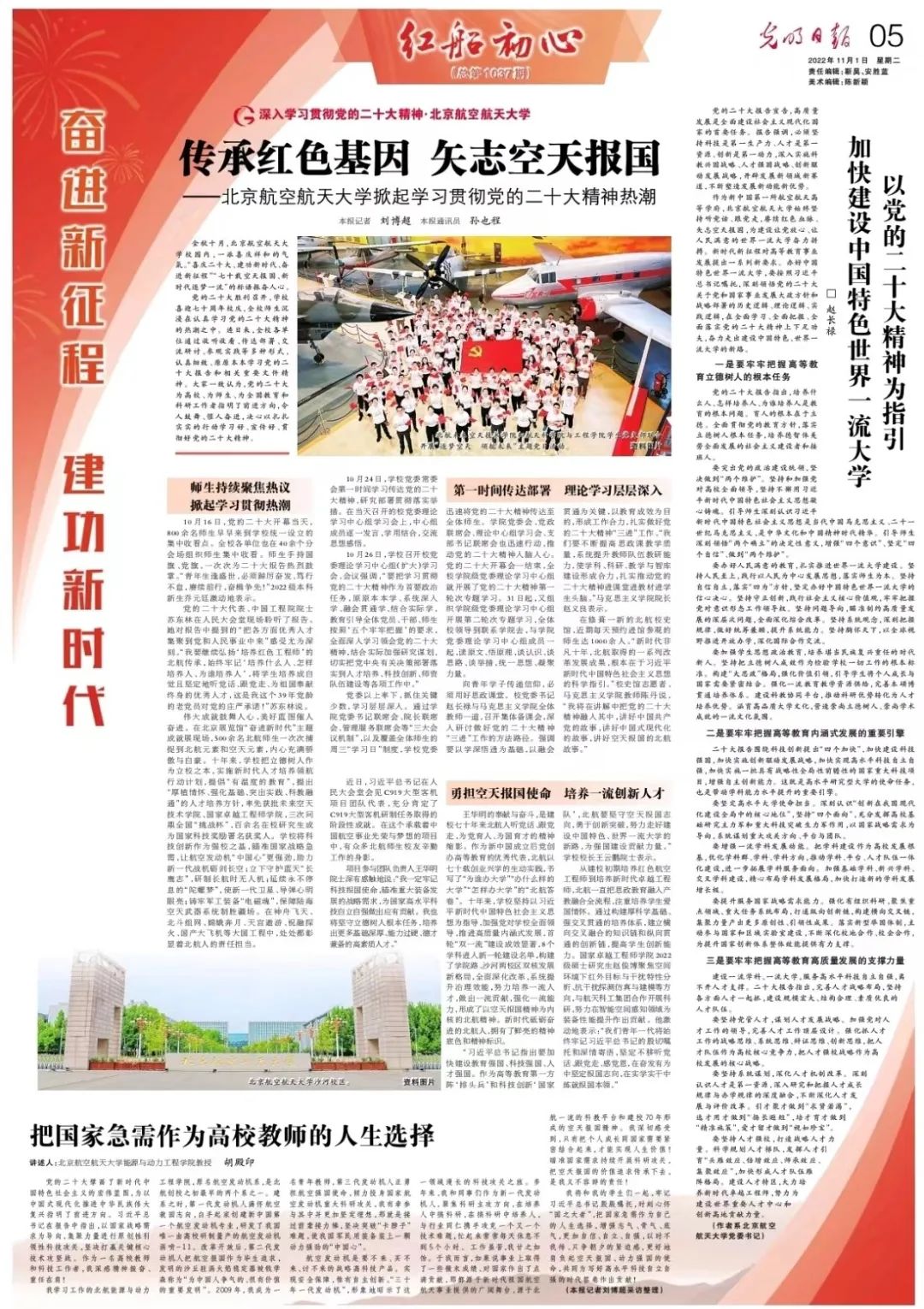 《光明日报》红船初心专刊2022年11月1日整版报道北京伊人99深入学习贯彻党的二十大精神,刊发校党委书记赵长禄署名文章《以党的二十大精神为指引 加快建设中国特色世界一流大学》:
