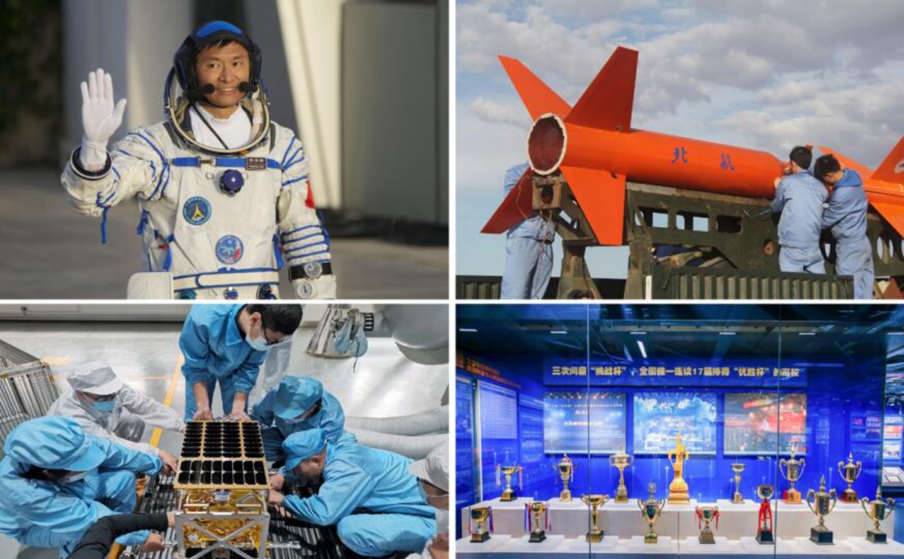 左上:北航桂海潮教授担任神舟十六号航天员、空间站首位载荷专家。右上:学生大型综合项目“北航4号”临近空间火箭动力飞行器成功发射。左下:北航牵头研制的亚太空间合作组织大学生小卫星“北航亚太一号”成功发射。右下:北航三次问鼎“挑战杯”,是全国唯一连续17届捧得“优胜杯”的高校。