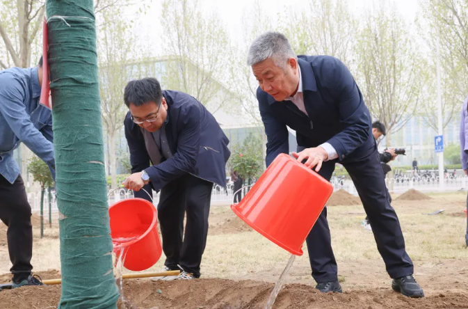 植树现场,劳动场面繁忙有序,大家挖坑、立苗、填土、浇水,合力栽下30株优质树苗,包括红枫、红梅、高杆月季等树种,为沙河校园新添一片观赏区域。