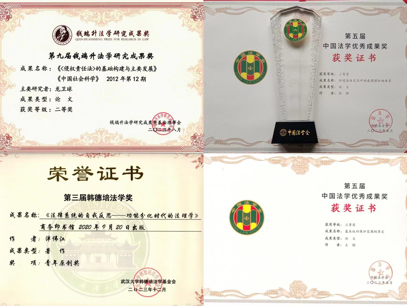 2023年3月,龙卫球教授再次当选中国法学会网络与信息法学研究会副会长(左上);2020年6月,龙卫球教授当选中国行为法学会副会长(右上);2023年10月,杜群教授再次当选中国法学会环境资源法学研究会副会长(左下);2016年6月,任自力教授再次当选中国法学会保险法学研究会副会长兼秘书长(右下)