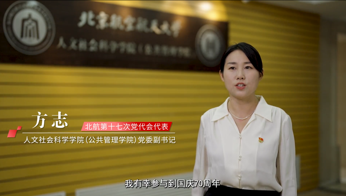 北航第十七次党代会代表 人文社会科学学院(公共管理学院)党委副书记 方志:我有幸参与到国庆70周年“关键抉择”群众游行方阵、建党百年庆祝活动、北京“三优一先”表彰大会、学校人才培养大会等,感受到了国家的繁荣昌盛,感受到了学校、学院的高质量快速发展。