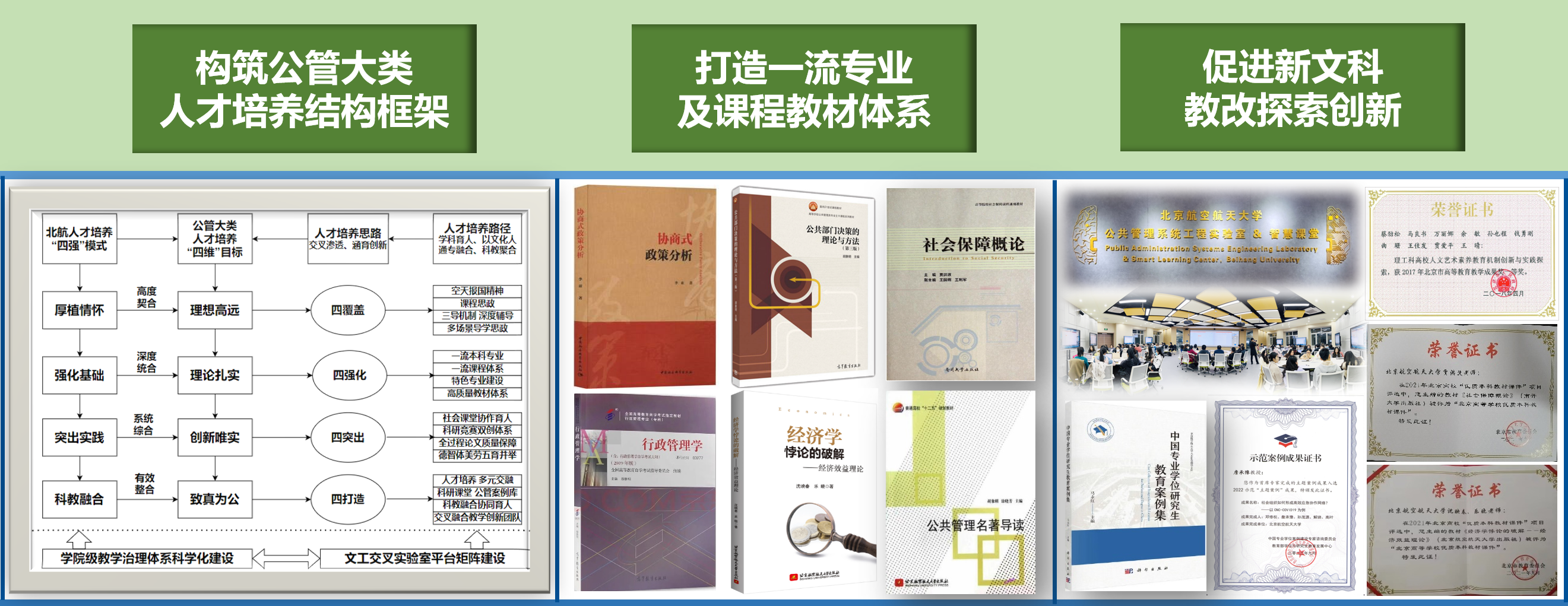 学院聚焦国家治理体系和治理能力现代化战略需求,持续强化有组织的科研创新,研究成果获评高等学校科学研究优秀成果奖(人文社会科学)一等奖1项,实现了北航获国家文科最高等级奖励一等奖“零突破”。近五年,学院还获得全国教育科学研究优秀成果奖、北京市哲学社会科学优秀成果奖、工业和信息化优秀研究成果奖、民政部优秀研究成果奖等重要标志性奖励十余项。获批国家级纵向课题持续增长,其中近三年学院获批国家社科基金重大重点项目、国家自然科学基金重点项目等7项。学院教师发表出版了一大批具有相当学术价值和影响力的论文、专著、译著和研究报告。加强中国特色新型文科智库建设,平均每年向上级提交50余篇资政报告,其中三分之一被中央及省部级领导批示或被采纳。文工交叉科研创新平台矩阵建设取得新进展,新建成的“公共管理系统工程实验室”发挥科教融合、协同育人作用凸显,科研创新迈入内涵发展、跨越提质的新阶段。