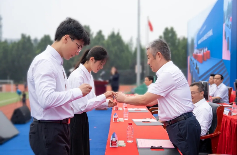 典礼上,赵长禄为新生代表授予校徽。两地三校园2024级新生齐将校徽佩戴在胸前,带着自豪感和责任感,成为勇担使命的新北航人。