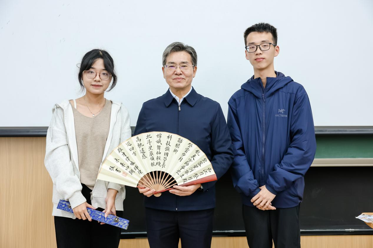在互动环节,于登云耐心解答了同学们的问题,嘱托大家矢志空天、筑梦北航。2024级学生特意准备了精美的折扇作为礼物,表达对院士的敬意与感谢。