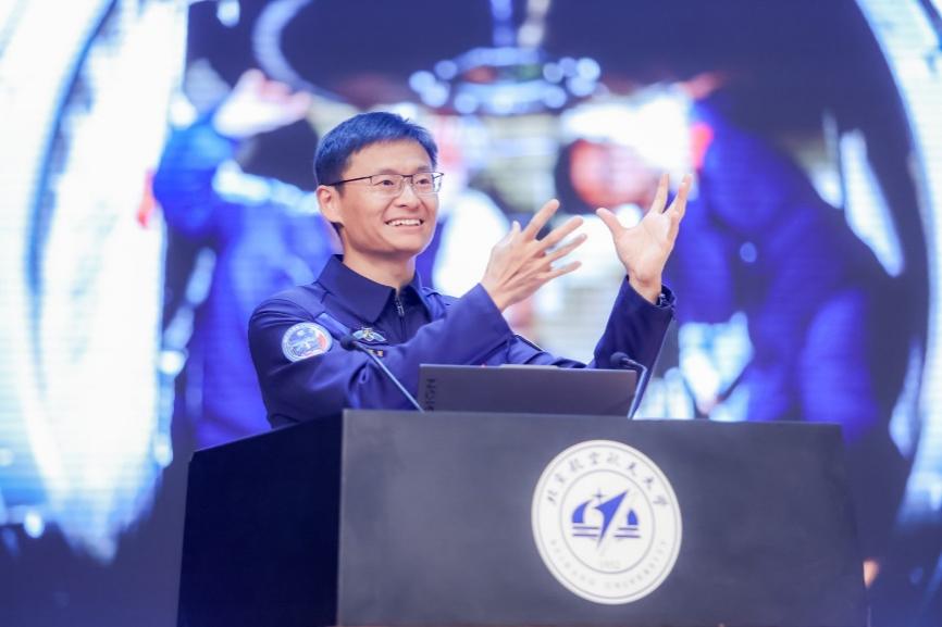 为了表达对桂海潮老师的敬意和感谢,两名来自沈元学院的2024级学生代表为桂海潮送上鲜花,这不仅是对桂海潮个人成就的赞美,更是对航天精神的传承和致敬。在报告中,桂海潮还带来了一个特殊的环节——“航天科普问答”,在开展专题报告的同时也向同学们提出关于航天科普知识相关的问题,增强同学们对祖国航天事业的认识,同学们积极参与,踊跃回答。互动环节,同学们也怀着激动的心情与桂海潮展开交流,纷纷展示出对太空生活的好奇与向往,询问了桂海潮在空间站生活的独特性。桂海潮的亲身经历展现了北航人的家国情怀、拼搏精神,更为同学们树立起榜样力量,激励着广大师生探索浩瀚宇宙,逐梦星辰大海。