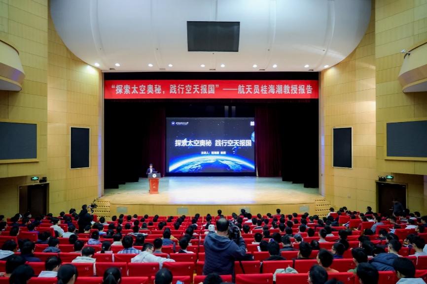 视频结束后,桂海潮为学生们带来《探索太空奥秘,践行空天报国》专题报告,在报告中,桂海潮首先向同学们介绍了航天员选拔与训练的艰辛历程,回顾了在空间站工作与生活的点点滴滴,并分析了我国载人航天未来的发展等,最后寄语同学们将个人成长与国家发展紧密结合,永葆对祖国航天事业的梦想和热爱,在同学们的心中播下空天报国的种子,在座师生无一不深受感动。