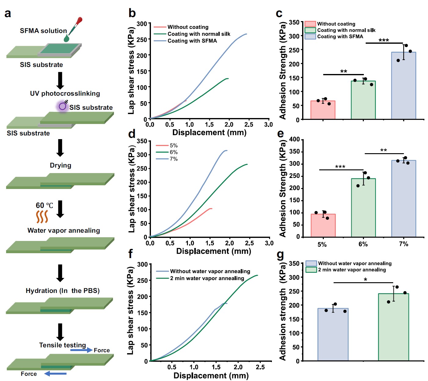 图3.光固化和水蒸汽退火处理增强了SFMA微槽涂层和SIS基底之间的界面结合强度