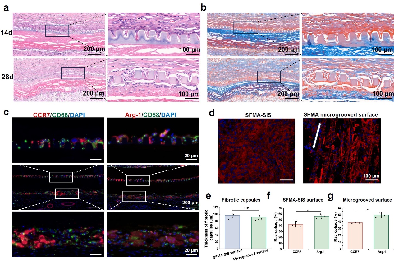 通过SD大鼠皮下模型验证了微沟槽的稳定性以及与组织整合情况,如图4所示,在植入后28天,微沟槽的结构开始崩解,这表明SFMA微沟槽已经发生了生物降解。此外,大量宿主细胞分布在微沟槽内,且SFMA微沟槽表面和SFMA-SIS表面均显示出类似的纤维囊形成,这表明微沟槽涂层与宿主组织整合良好。此外,SFMA微沟槽表面和SFMA-SIS表面均以Arg-1阳性巨噬细胞为主,这表明SFMA微沟槽涂层类似于生物活性SIS膜,能够促进巨噬细胞向M2表型极化。