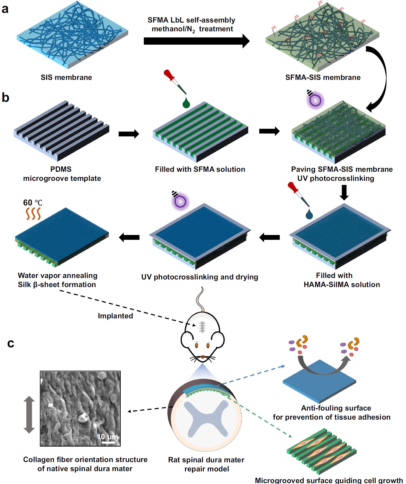 该研究开发了一种新型的Janus小肠黏膜下层(SIS)膜材料,通过在SIS表面涂覆丝素基水凝胶涂层,实现了对硬脊膜修复和防止硬膜外粘连的双重功能:内层丝素蛋白(SF)和甲基丙烯酰化丝素蛋白(SilMA)复合(SFMA)微沟槽涂层可引导细胞定向生长,促进硬脊膜再生;外层的甲基丙烯酰化透明质酸(HAMA)和SilMA复合涂层则能有效抵抗蛋白吸附和细胞粘附,抑制硬膜外纤维化粘连(图1)。