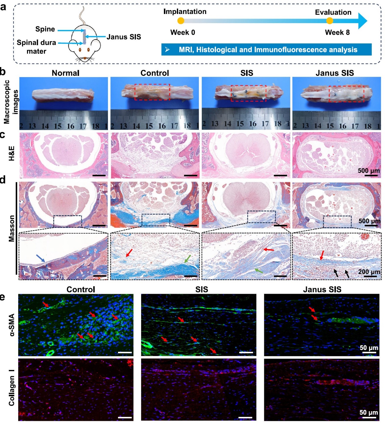 该研究采用椎板切除术模型来制造硬脊膜缺损,以评估Janus SIS膜在体内的治疗效果(图6)。从脊髓组织的宏观图像可以看出Janus涂层组的外观与天然硬脊膜相似。同时通过H&E染色和Masson三色染色可以看出Janus SIS组的硬膜缺损区域观察到连续的新生成胶原组织,与正常硬膜组织高度相似。磁共振成像(MRI)结果表明术后8周Janus SIS显示出脊髓与硬脊膜外组织之间更清晰的边界。α-SMA和胶原蛋白I的免疫荧光染色进一步评估硬膜外纤维化粘连,与SIS组相比,Janus SIS组硬膜外组织中的α-SMA阳性细胞数量更少;对照组硬膜外区域被广泛密集的胶原蛋白I占据,而植入SIS和Janus SIS的组中胶原蛋白I的表达显著降低。