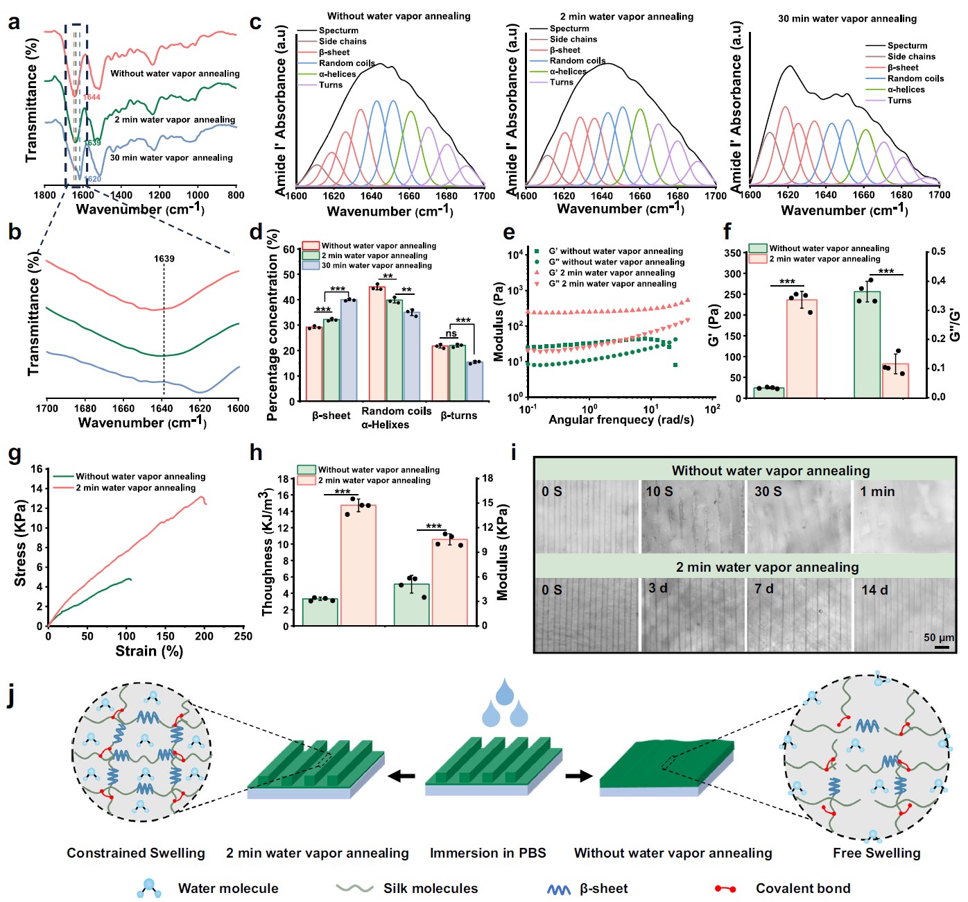 该研究为了使SFMA微槽涂层吸水后结构稳定,利用了水蒸汽热处理工艺。如图2所示,与未处理的微槽涂层相比,经过水蒸汽处理后的SFMA微槽涂层的二级结构发生变化,进而导致其力学和结构稳定性有显著提升。