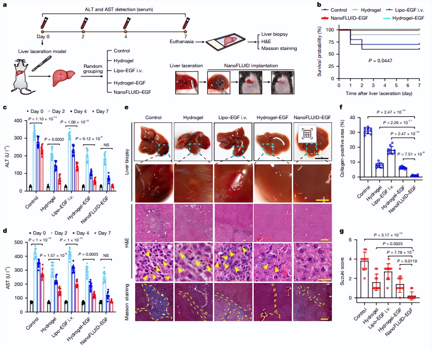 团队建立了小鼠急性创伤性肝损伤模型,验证了贴片在肝脏创伤治疗中的疗效。“与传统缝合、电灼或水凝胶止血方法相比,贴片能帮助创口即时止血。贴片治疗组小鼠7天存活率达到了100%。”常凌乾说,贴片还通过递送表皮生长因子基因显著促进了肝细胞再生,使小鼠肝功能指标在7天内恢复正常。这种创新的治疗方式,为内脏器官急性创伤救治提供了新的治疗方案,展现出临床转化价值。