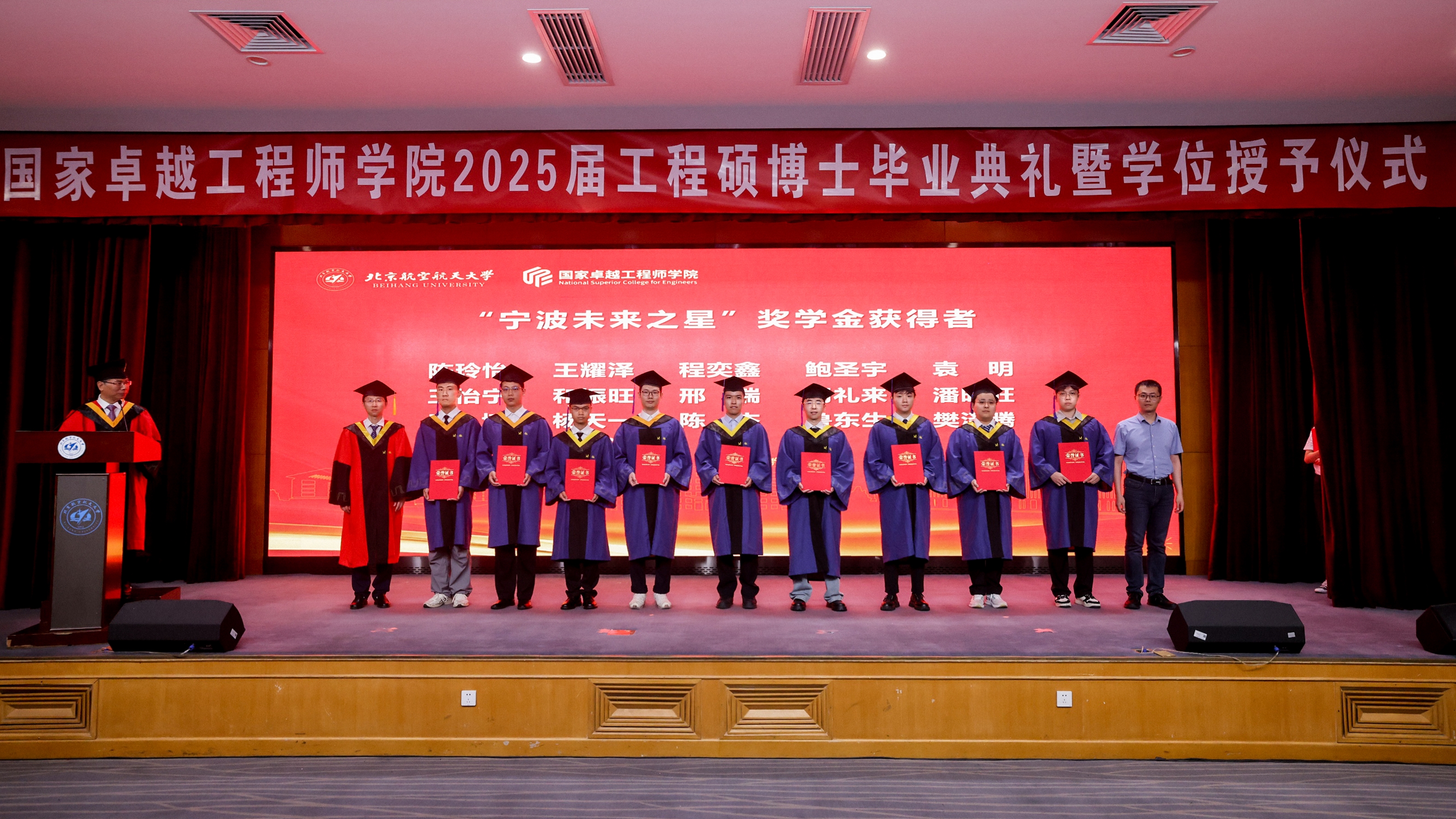 吴江浩和宁波市人力资源和社会保障局人才开发处副处长罗雨辰为“宁波未来之星”奖学金获奖者颁奖,激励优秀工程硕博士研究生练好本领、服务国家。随后,首届工程硕博士毕业生代表为赴企学生代表授旗,挥舞的国家卓越工程师学院旗帜宣告2025年工程硕博士正式出征赴企实践。