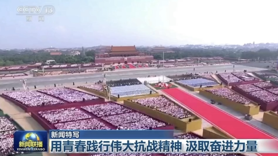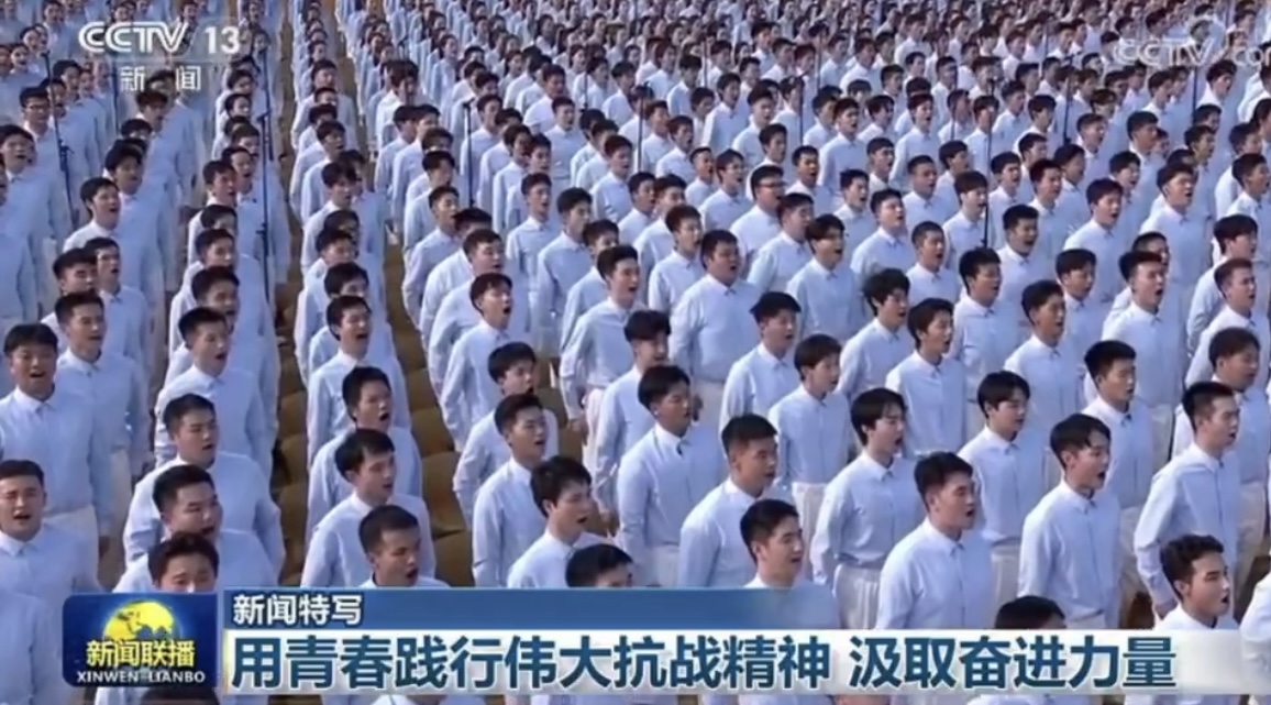 【主持人】在纪念中国人民抗日战争暨世界反法西斯战争胜利80周年大会上,来自北京40所高校的3000名学生组成的合唱团,用4首动人心弦的歌曲为大会暖场,感悟伟大抗战精神、汲取奋进力量。