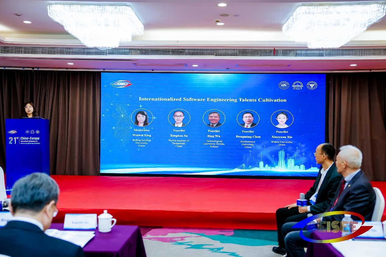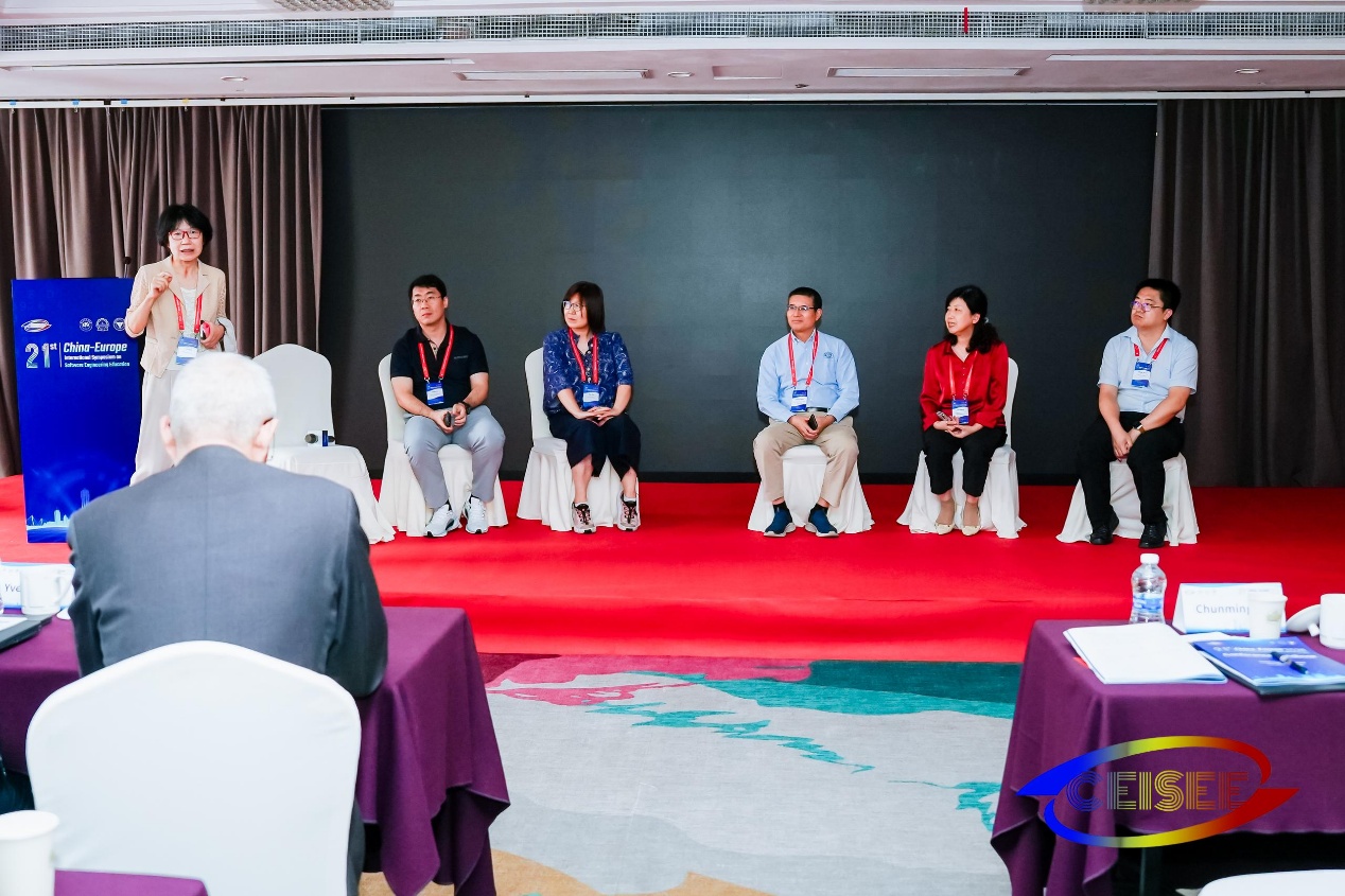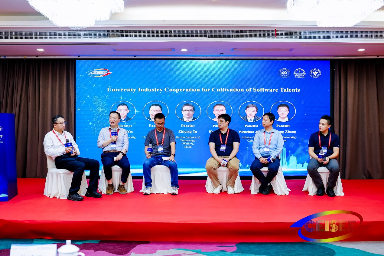 21日上午分别邀请了徐晓飞和澳门城市大学教授周万雷做特邀报告。徐晓飞分享了生成式AI赋能软件工程教育的新模式和新方法,提出了生成式AI赋能的软件工程能力培养、评估和认证体系;周万雷分享了基于道德和安全评估构建大型语言模型培训框架、设计道德和安全之间的动态平衡解决方案。上午还设置了两个高峰论坛,“校企合作软件人才培养”(“University Industry Cooperation for Cultivation of Software Talents”)论坛由浙江大学尹建伟教授主持,邀请了来自利兹大学教授徐洁、哈尔滨工业大学(威海)教授涂志莹、华为郭寒军、阿里云周文超和浙江大学教授张旭鸿参与研讨,围绕大学与产业合作培养软件人才的最大结构性障碍等问题展开讨论;“国际化软件人才培养”(“Internationalized Software Engineering Talents Cultivation”)论坛由北京交通大学教授邢薇薇主持,邀请了吴兵、哈尔滨工业大学教授苏统华、东北大学教授陈东明和武汉大学教授谢晓园参与研讨,围绕研究国际课程建设、工程能力培养、国际交流与合作等国际化软件工程人才培养相关问题展开讨论。