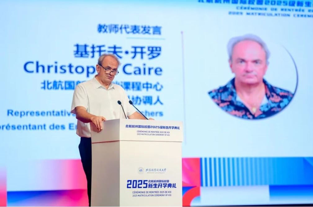 北航新闻网9月30日电(记者 任和 通讯员 谢雨倩 宋超 马证超 王琳)9月29日上午,杭州国际校园2025级新生开学典礼在音乐厅举行。北航党委书记赵长禄,法国法兰西工程院院士、2024年“中国政府友谊奖”获得者、北航中欧委员会联合主席杰拉德·科赛,法国国立民航大学校长奥利维耶·尚苏、法国国立应用科学学院集团里昂董事会主席克里斯蒂安·尼布雷尔、法国国立应用科学学院里昂校长佛雷德里克·弗提亚都、法国国立应用科学学院里昂国际关系副校长达米安·法布雷格、西班牙瓦伦西亚理工大学副校长何塞·蒙塞拉特、浙江省教育厅副厅长舒培冬、北航副校长赵巍胜及北航中法航空学院、北航中法未来科技学院、国际教育中心共700余名中外本研新生参加活动。