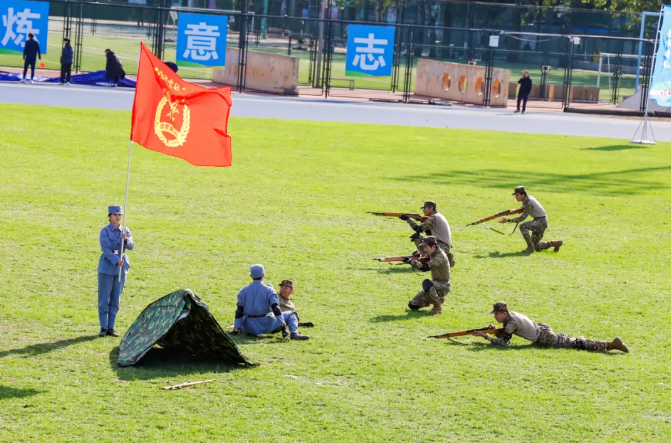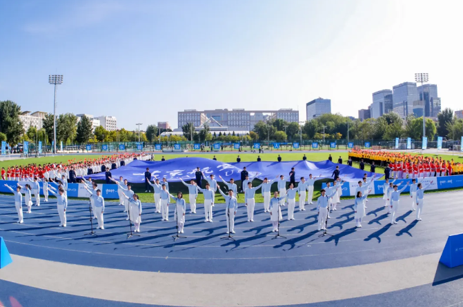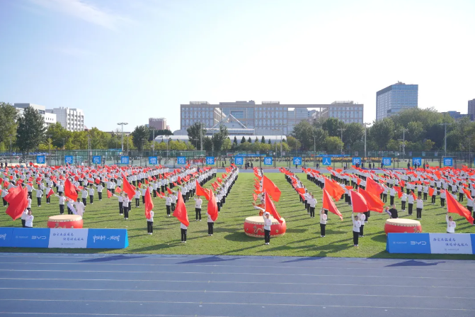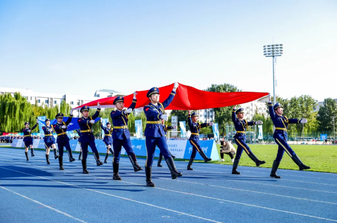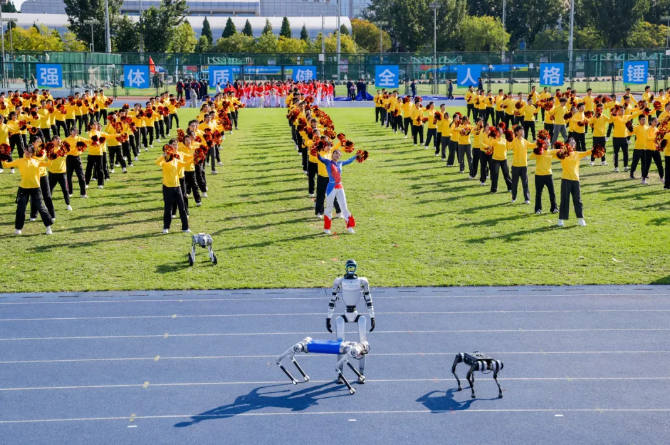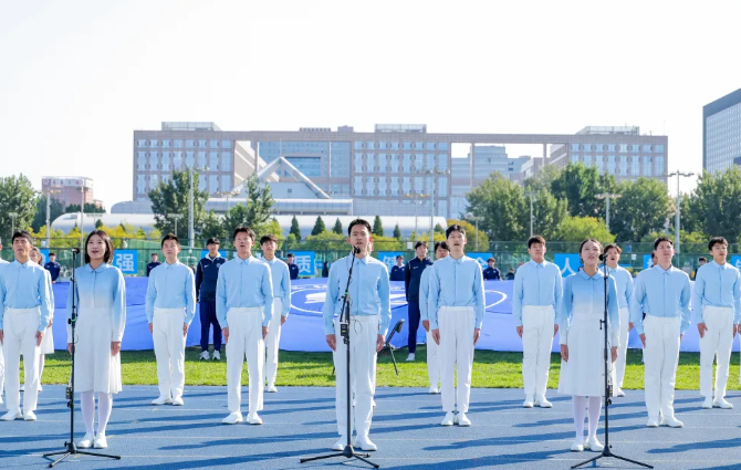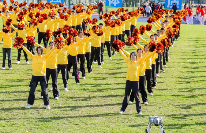 体育为骨,文艺注魂。1300余名师生共同呈现了精彩纷呈的体育文艺展演,展示北航体育文化建设丰硕成果,为这场体育盛会锦上添花。旗展山河,武动少年意气;龙腾云海,尽显华夏神韵,600余名北航学子以旗为笔绘乾坤,以拳为墨书正气,展现着中国传统体育文化的独特魅力;利刃出鞘、拳拳生风,北航猎鹰突击队战士奋楫向前,用战术动作呈现烽火岁月,用青春热血致敬英雄旗帜;逐梦苍穹,活力启航,与啦啦操队员们一起,由北航机械学院空间机器人实验室、北航具身智能机器人研究院和北航机器人队共同研制的四足机器人等机器人亮相操场。舞步轻盈、动感十足,随着音乐节奏,共同演绎别样的浪漫;乐声磅礴、歌声激昂,参与纪念中国人民抗日战争暨世界反法西斯战争胜利80周年大会广场合唱团成员代表与北航行进管乐团,共同演绎乐曲《请你检阅》,牢记使命、踔厉奋发,用歌声穿越历史长河,唱响对祖国的深情礼赞。