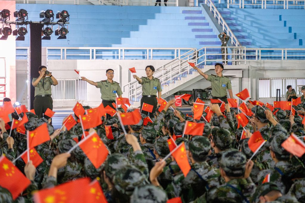 比赛最后,596团和424团的教官们分别带来歌曲《祖国不会忘记》《假如战争今天爆发》,并带领全体同学合唱《强军战歌》《当祖国召唤的时候》,现场红旗飘扬、掌声雷动,喝彩声久久不息。