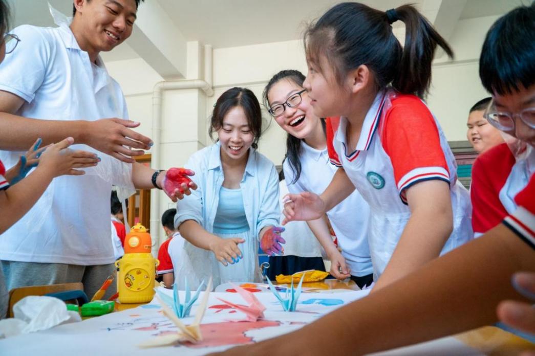 图为实践队成员开展外交主题美育课,与同学们共同创作“地球村”主题手印画。