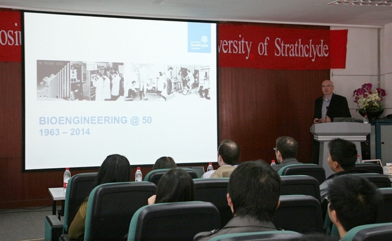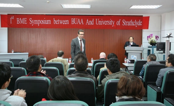 会上,英国斯特拉斯克莱德大学Richard Black教授介绍了斯特拉斯克莱德大学医疗仪器学院以及博士生培训中心;我校生物与医学工程学院副院长蒲放教授介绍了北航生物与医学工程学院的主要研究方向、研究成果新进展以及国际交流情况;我校郑成功教授介绍了国际植介入医疗器械转化研究中心的主要研究方向、研究成果新进展。