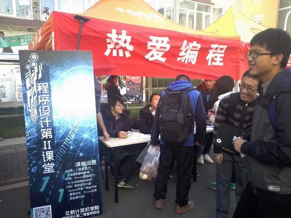据悉,本学期计算机学院“程序设计第二课堂”面向沙河校区全体本科生,共设C语言提高、Python教学和计算机技术普及三类教学班和一个技术沙龙,并从计算机学院2013级本科生中选拔15名优秀本科生组成授课团队。“第二课堂”目前已开通微信公共号“航小猿”(微信号:buaahxy), 通过现场和网络报名的形式招收学员300余名。