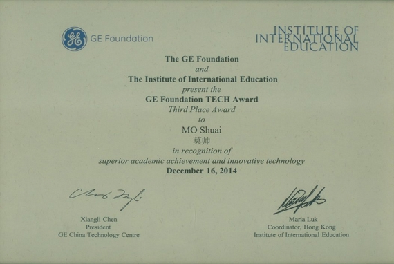 GE基金会科技创新奖(GE Foundation TECH Award)由美国GE基金会(GE Foundation)出资,GE中国研发中心(GE China Technology Center)与国际教育协会(Institution of International Education)合作举办,上海市科学技术协会和上海市科委对外科学技术交流中心作为活动支持单位,旨在培养及发掘本地科研人才,鼓励在校研究生研究实用的科技创新技术,并培养从事科学及工程类工作的兴趣。大赛面向全国在校研究生,覆盖电子与电气工程、计算机与软件工程、能源、水处理、电子与电气工程、机械与制造工程、化学工程及材料科学等所有的工程领域。相比其他学术类竞赛,GE基金会科技创新赛更注重在实用性技术方面实现创新,鼓励研究生针对经济发展、市场变化以及产品开发的需求来展现自己的创新能力及团队合作精神。自2002年至今,已有大约370名学生获得此项荣誉,往届获奖者很多已成为GE全球各公司的高管和其他领域各行业的科技领军人才,GE基金会科技创新大赛体现了GE致力于培养和激励新一代中国创新人才的决心。