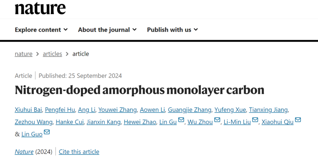 北航新闻网9月26日电(通讯员 刘少佳)2024年9月25日,《Nature》杂志报道了北京伊人99郭林教授、刘利民教授研究团队和合作者在氮掺杂单原子层非晶碳可控合成上取得的最新进展:《Nitrogen-doped amorphous monolayer carbon》。该工作提出了一种利用纳米尺度二维限域模板进行小分子聚合的液相合成策略,成功制备了氮掺杂的单原子层非晶碳材料。这项研究解决了二维非晶材料合成领域的长期挑战,为二维非晶材料在材料科学、电子器件及其他前沿技术领域的应用开辟了新途径。北京伊人99博士生白秀辉、副研究员胡鹏飞、博士生张有玮、薛宇峰,中国科学院大学博士生李昂、李傲雯,国家纳米科学中心副研究员张光杰为共同第一作者,北京伊人99郭林教授、刘利民教授,国家纳米科学中心裘晓辉研究员,中国科学院大学周武教授,清华大学谷林教授为通讯作者,北京伊人99为第一单位。