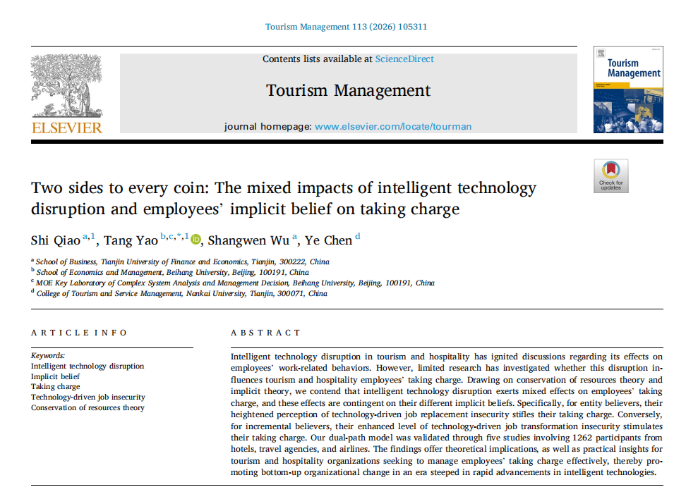 北航新闻网9月24日电(通讯员 艾梦囡)9月23日,北航经管学院副教授姚唐(唯一通讯作者)领衔的跨校研究团队,在旅游管理领域国际知名期刊Tourism Management在线发表题为“Two sides to every coin: The mixed impacts of intelligent technology disruption and employees'implicit belief on taking charge”(“事物皆有两面性:智能技术颠覆与员工内隐信念对主动负责行为的混合影响”)的学术论文,为旅游和酒店业数智化转型中的员工管理提供了全新理论视角与实践路径。