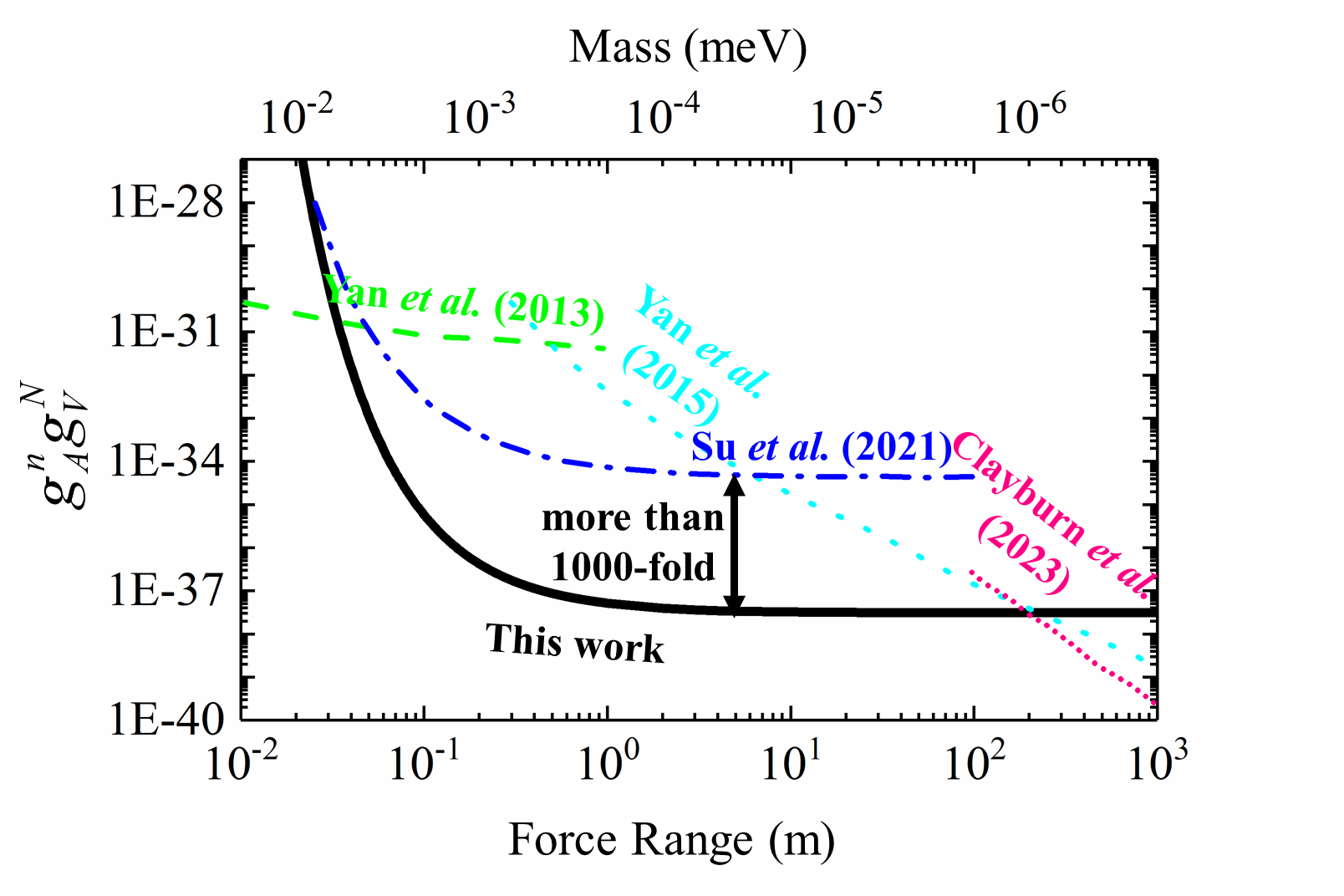 研究团队经过两年的调试测试,获得了一百多小时高质量数据,经过数据分析对一类关键的耦合常数设下了迄今最严格的实验上限,其探测灵敏度相比之前国际上的最佳结果提高了约1000倍。这一突破性成果不仅显著推进了对宇称破缺相互作用的实验限制,其探测范围更覆盖了从0.03米到400米的广阔作用区间,填补了天文观测与实验室小尺度测量之间的关键空白区域,为构建更完整的物理图景提供了不可或缺的实验数据。