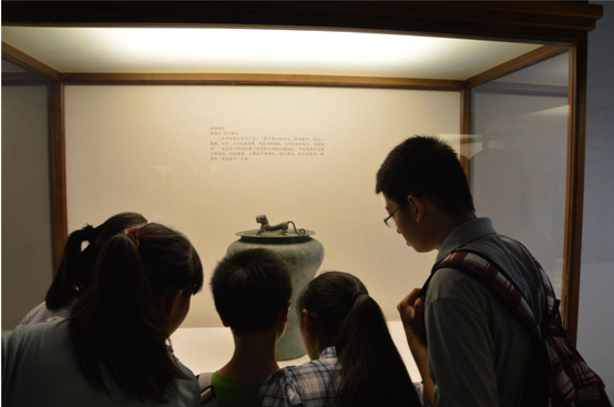 志愿者与孩子一同在故宫内参观展品