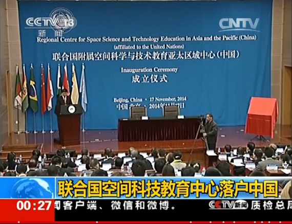 CCTV-1《午夜新闻》2014年11月18日报道:联合国空间科技教育中心落户中国